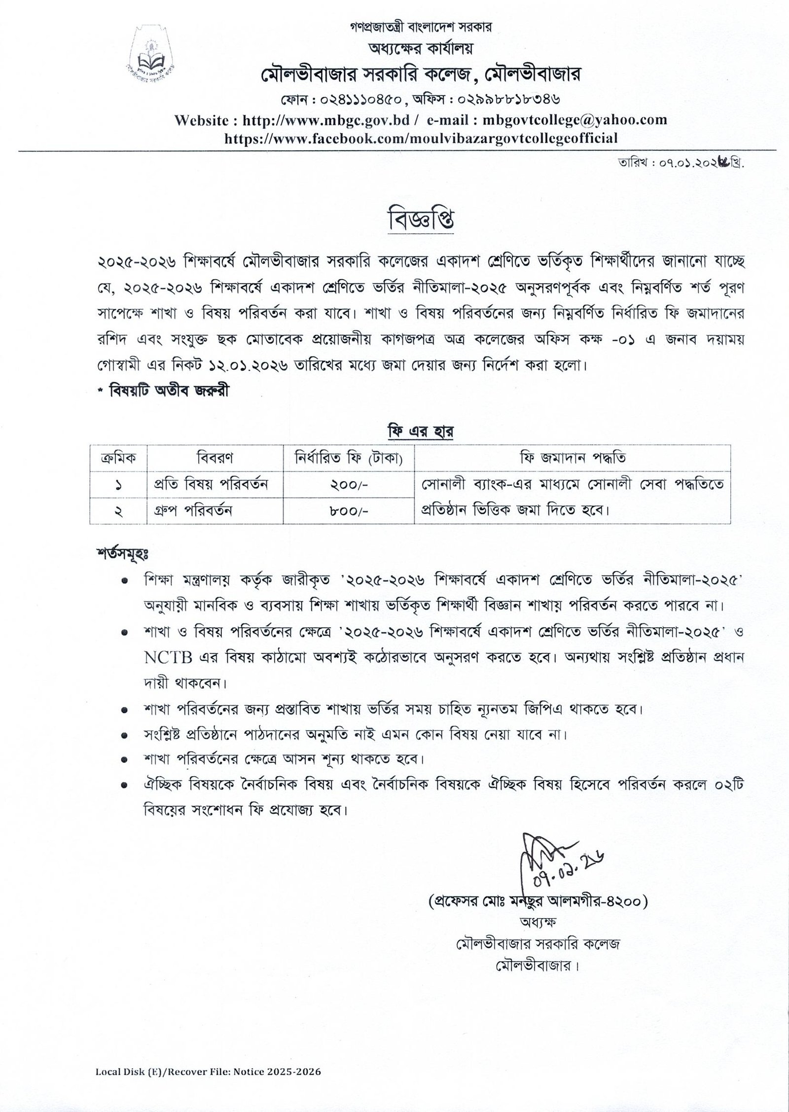 ২০২৫-২৬ শিক্ষাবর্ষে একাদশ শ্রেণীর শিক্ষার্থীদের শাখা ও বিষয় পরিবর্তনের বিজ্ঞপ্তি