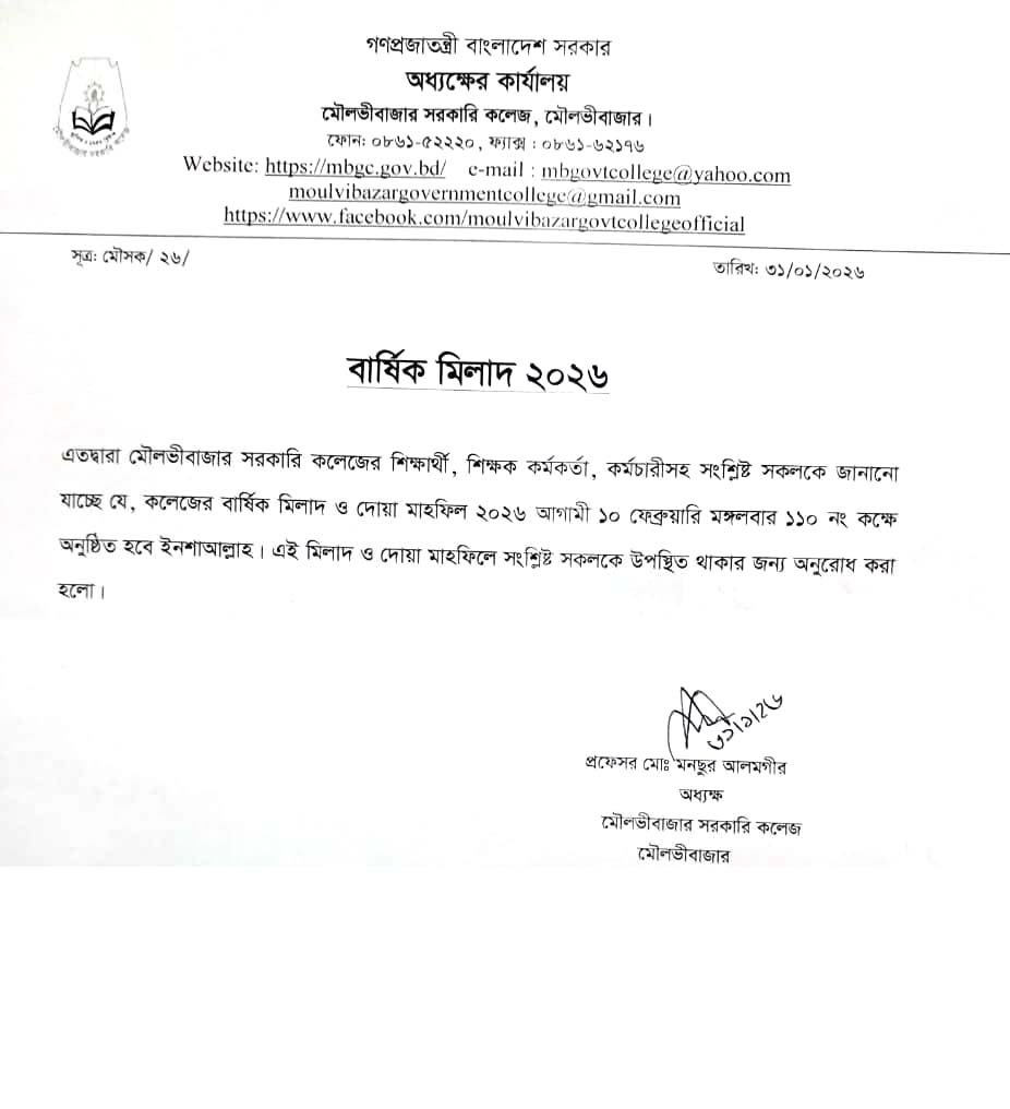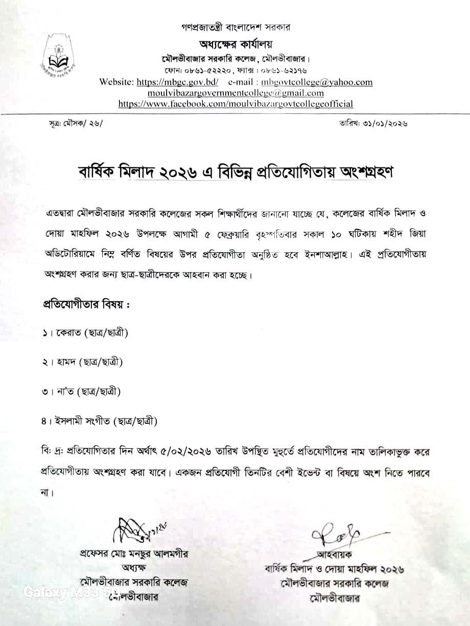 বার্ষিক মিলাদ-২০২৬ এর বিভিন্ন প্রতিযোগিতায় অংশগ্রহণ সংক্রান্ত বিজ্ঞপ্তি