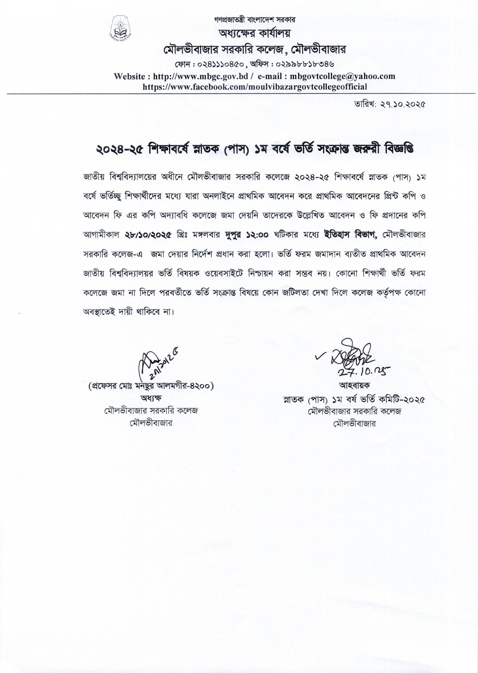 ২০২৪-২৫ শিক্ষাবর্ষে স্নাতক (পাস) ১ম বর্ষে ভর্তি সংক্রান্ত জরুরী বিজ্ঞপ্তি