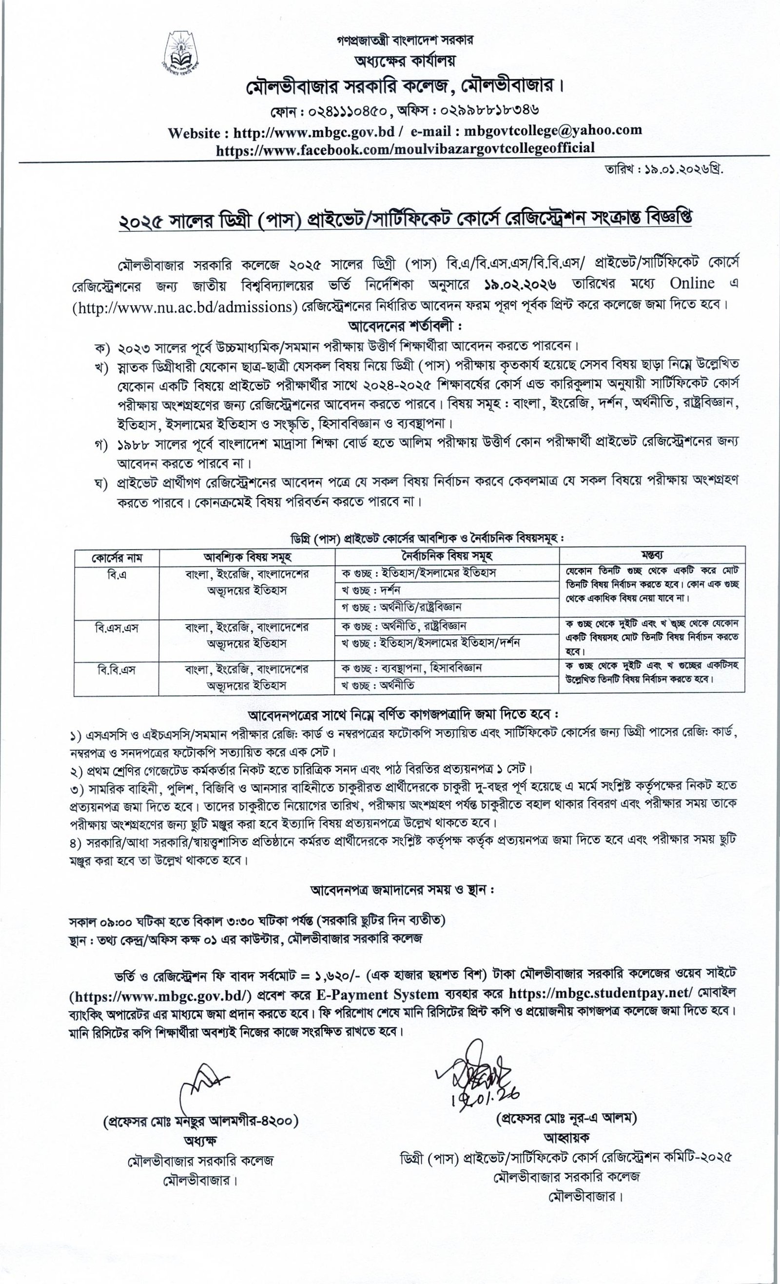 ২০২৫ সালের ডিগ্রী (পাস) প্রাইভেট/সার্টিফিকেট কোর্সে রেজিস্ট্রেশনের বিজ্ঞপ্তি