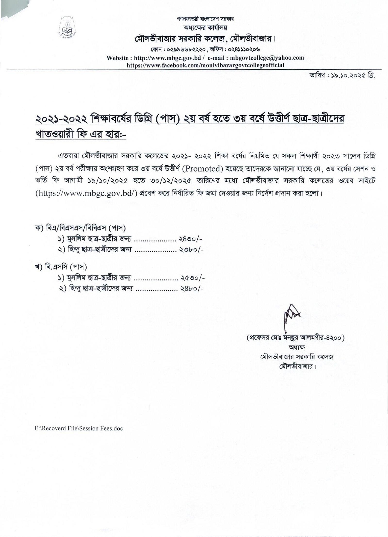 ২০২১-২২ শিক্ষাবর্ষের ডিগ্রি (পাস) ৩য় বর্ষে উত্তীর্ণ শিক্ষার্থীদের খাতওয়ারী ফি এর হার