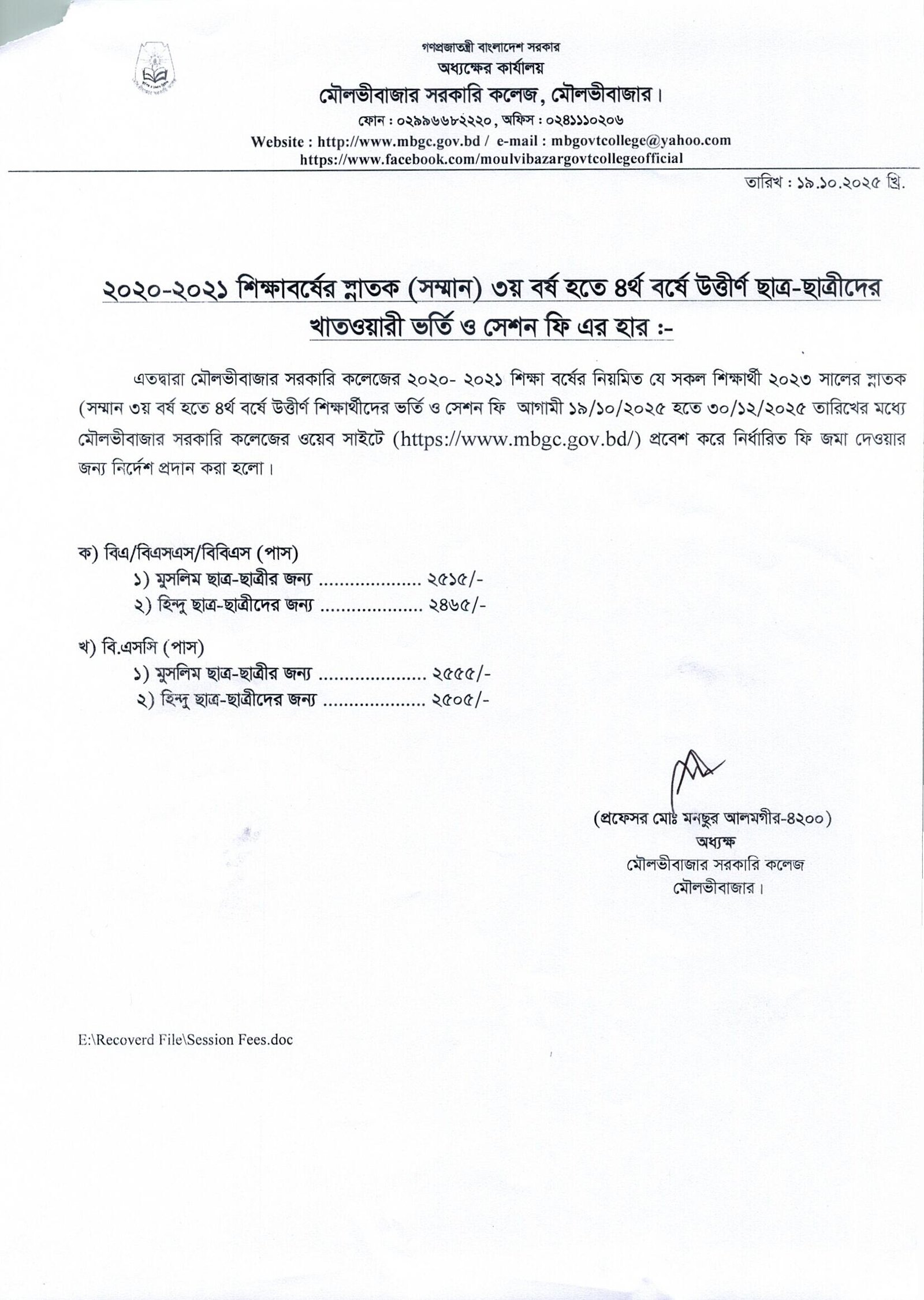 ২০২০-২১ শিক্ষাবর্ষের অনার্স ৪র্থ বর্ষে উত্তীর্ণ শিক্ষার্থীদের খাতওয়ারী সেশন ফি এর হার
