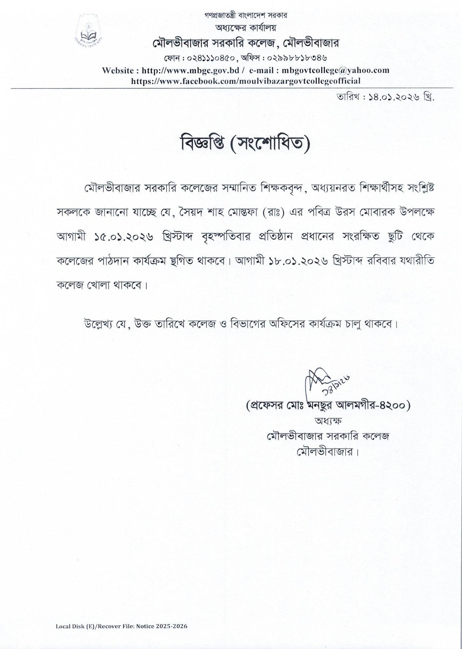 পাঠদান কার্যক্রম বন্ধের সংশোধিত বিজ্ঞপ্তি