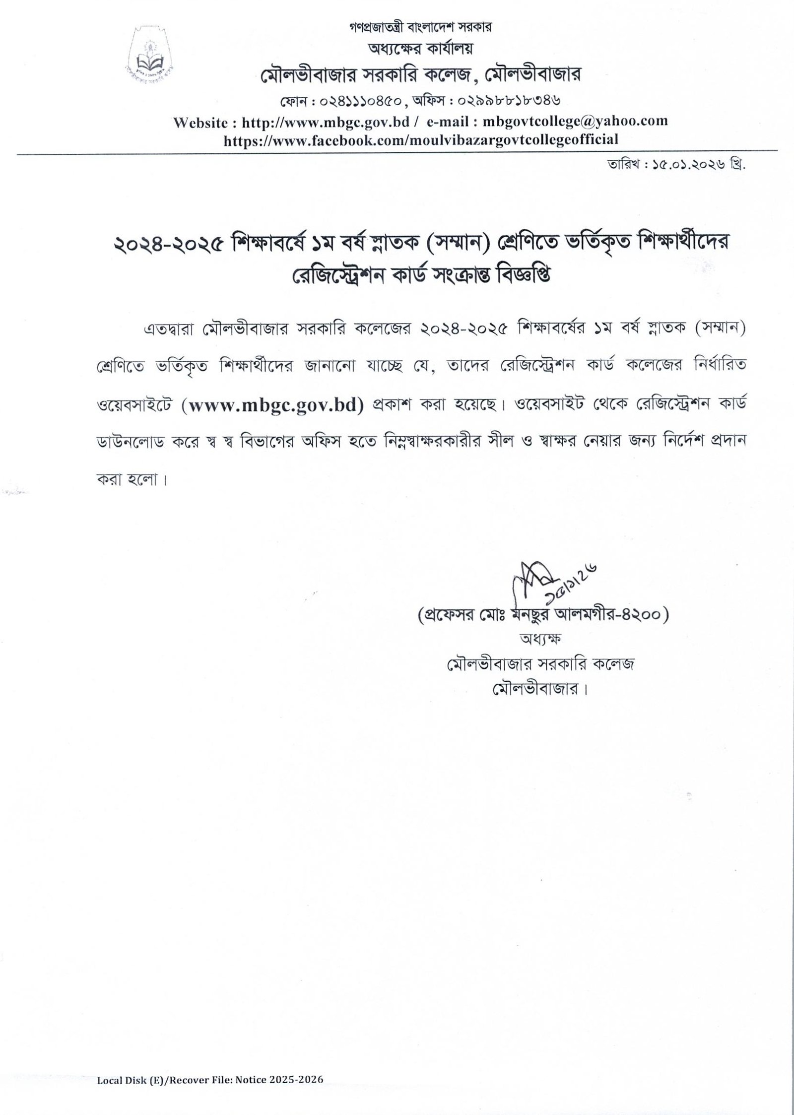 অনার্স ১ম বর্ষ (২০২৪-২০২৫) রেজিস্ট্রেশন কার্ড সংক্রান্ত বিজ্ঞপ্তি