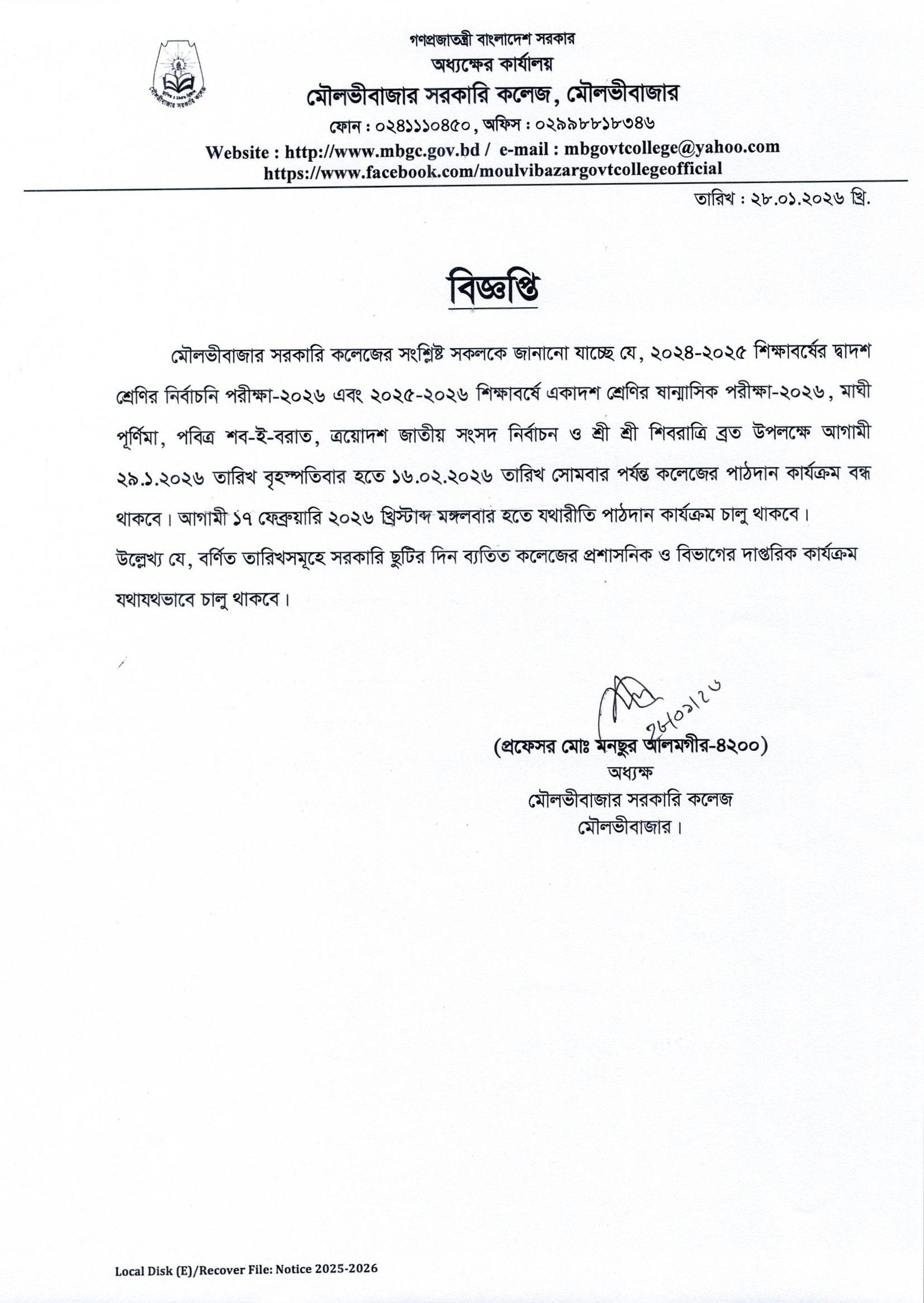 পাঠদান কার্যক্রম বন্ধের বিজ্ঞপ্তি