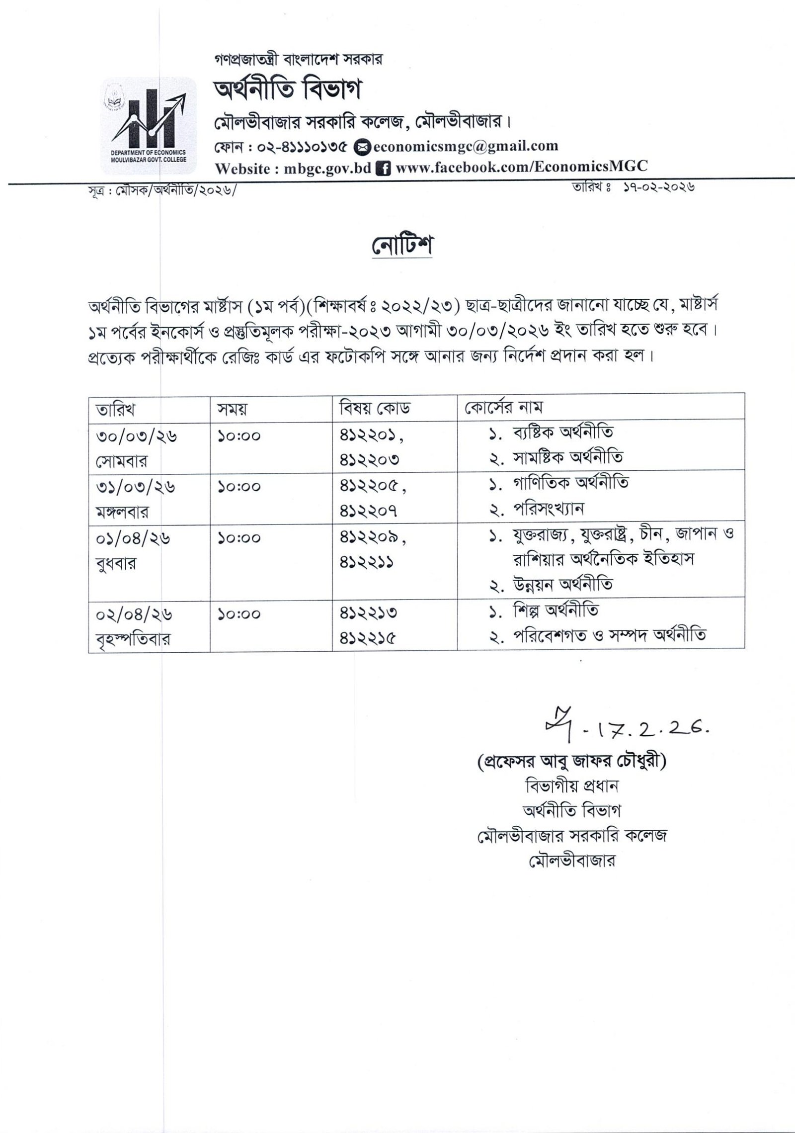 অর্থনীতি বিভাগের মাস্টার্স ১ম পর্ব (২০২২-২৩) শিক্ষাবর্ষের শিক্ষার্থীদের ইনকোর্স ও প্রস্তুতিমূলক পরীক্ষার সংক্রান্ত বিজ্ঞপ্তি