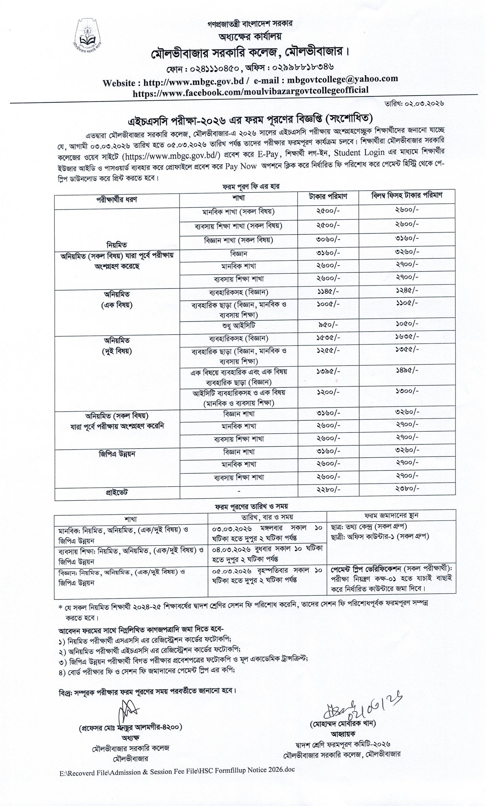 এইচএসসি পরীক্ষা-২০২৬ এর ফরমপূরণের বিজ্ঞপ্তি (সংশোধিত)
