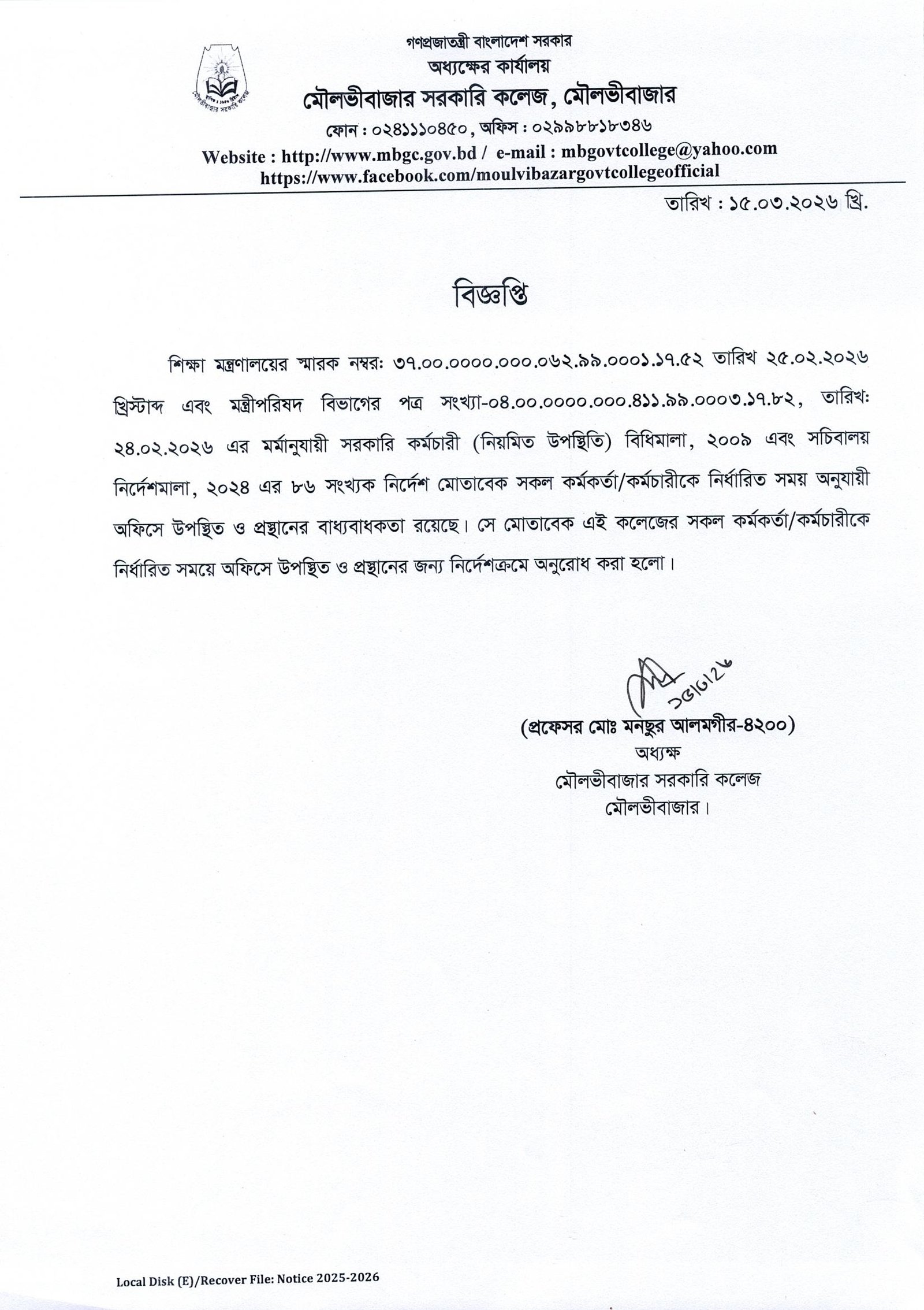 নির্ধারিত সময়ে অফিসে উপস্থিত ও প্রস্থান সংক্রান্ত বিজ্ঞপ্তি