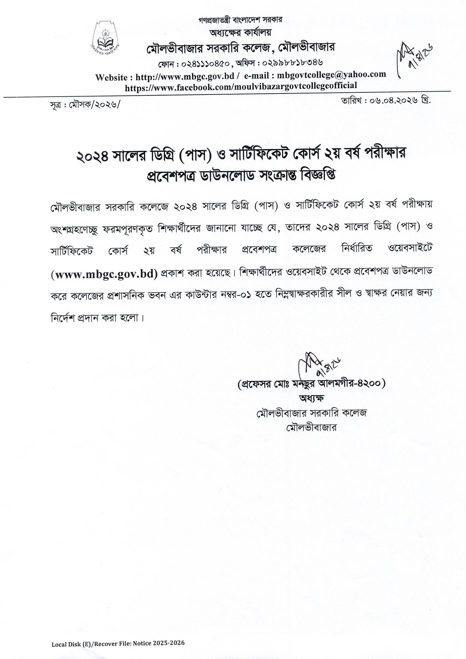 ডিগ্রি (পাস) ২য় বর্ষ পরীক্ষা-২০২৪ এর প্রবেশপত্র ডাউনলোডের বিজ্ঞপ্তি