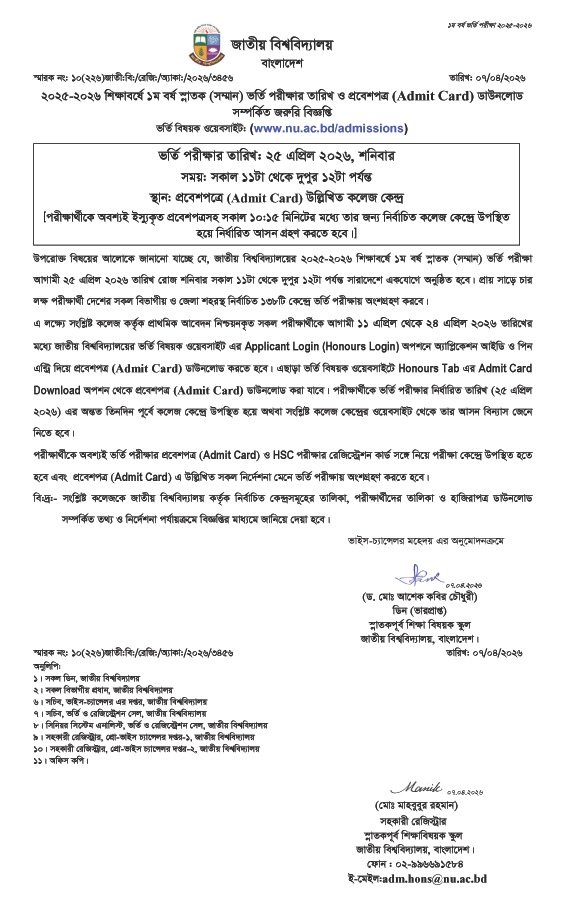 ২০২৫-২৬ শিক্ষাবর্ষে ১ম বর্ষ স্নাতক (সম্মান) ভর্তি পরীক্ষার তারিখ ও প্রবেশপত্র ডাউনলোড সম্পর্কিত জরুরি বিজ্ঞপ্তি
