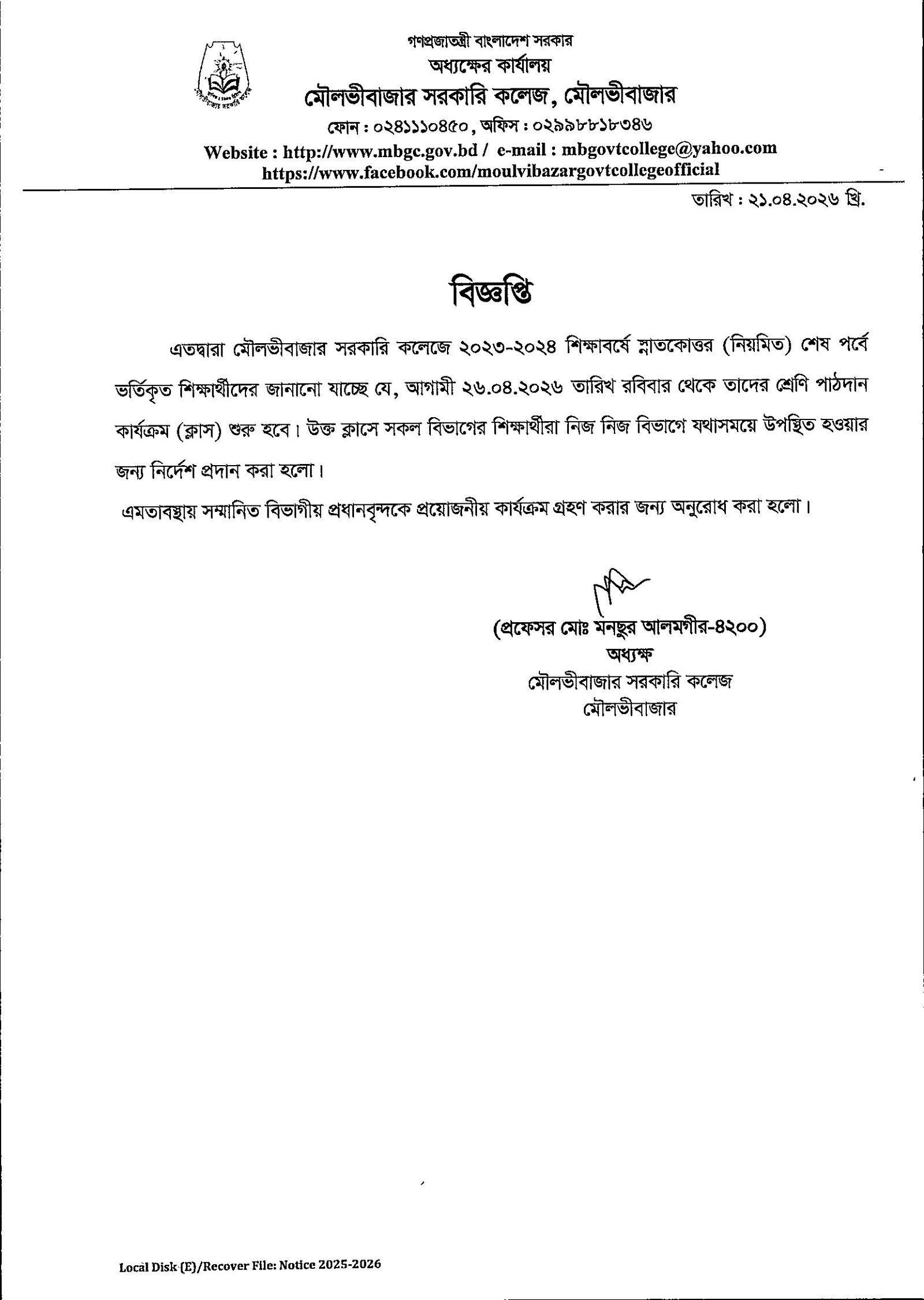 ২০২৩-২৪ শিক্ষাবর্ষে স্নাতকোত্তর (নিয়মিত) শেষপর্বে ভর্তিকৃত শিক্ষার্থীদের পাঠদান কার্যক্রম শুরুর বিজ্ঞপ্তি