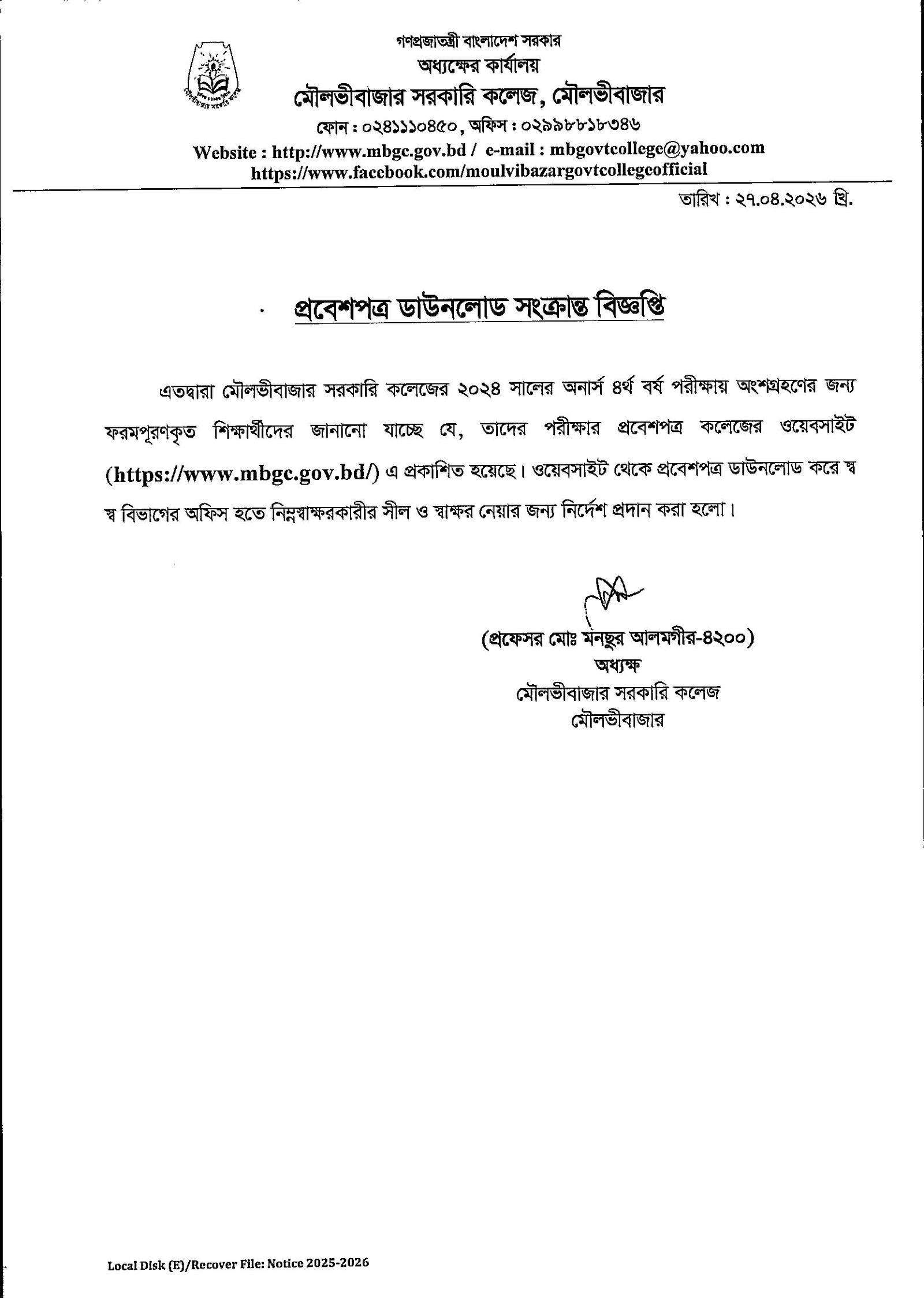 প্রবেশপত্র ডাউনলোড সংক্রান্ত বিজ্ঞপ্তি