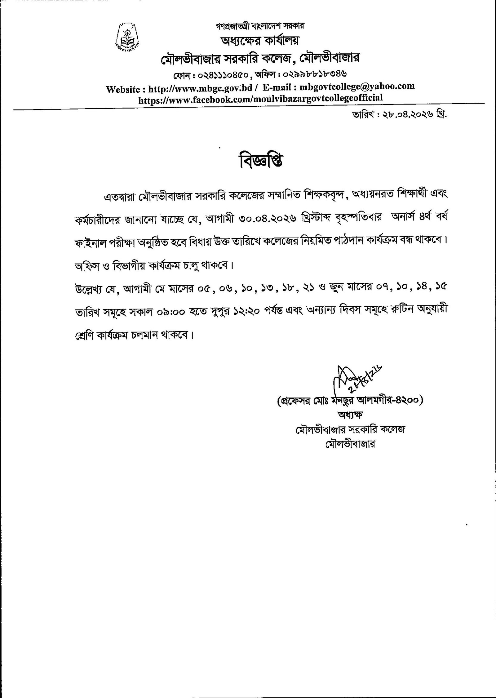 পাঠদান সংক্রান্ত বিজ্ঞপ্তি